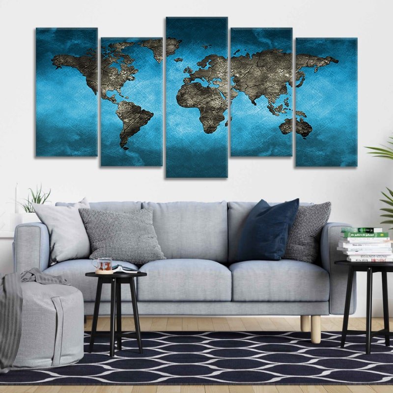 World Map Wall Art For Office l Blue Map Of The World Canvas Art Set